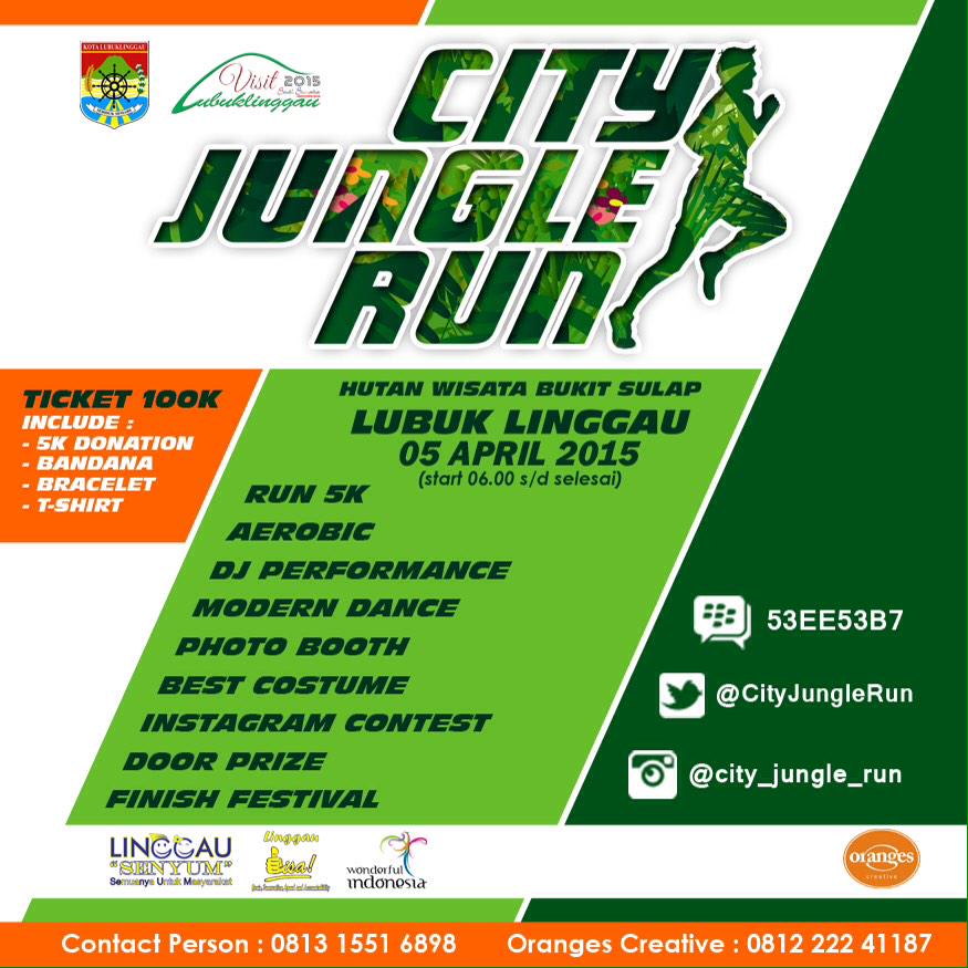 CITY JUNGLE RUN merupakan ajang lari di hutan wisata dalam kota. Di acara ini siapapun bisa bergabung tanpa memandang umur dan gender, Entah anda pejalan kaki atau atlit olimpiade. Jalur 5K akan jadi jarak panjang yang anda nikmati lebih dari sekedar lomba lari "CITY JUNGLE RUN" tidak disertai perhitungan waktu, Kalian akan menikmati keindahan alam hutan di dalam kota yang disertai rintangan di tiap kilometernya dan berlanjut sampai garis finish dengan "FINISH FESTIVAL" meriah. melibatkan bnyak warna yang tak terlupakan!